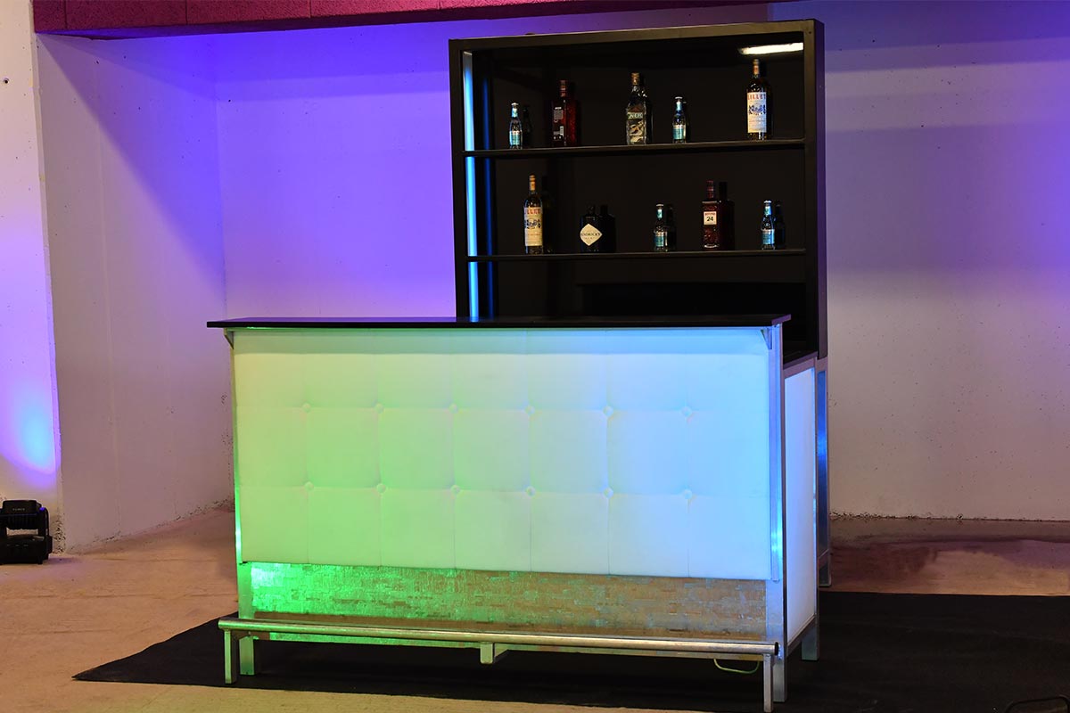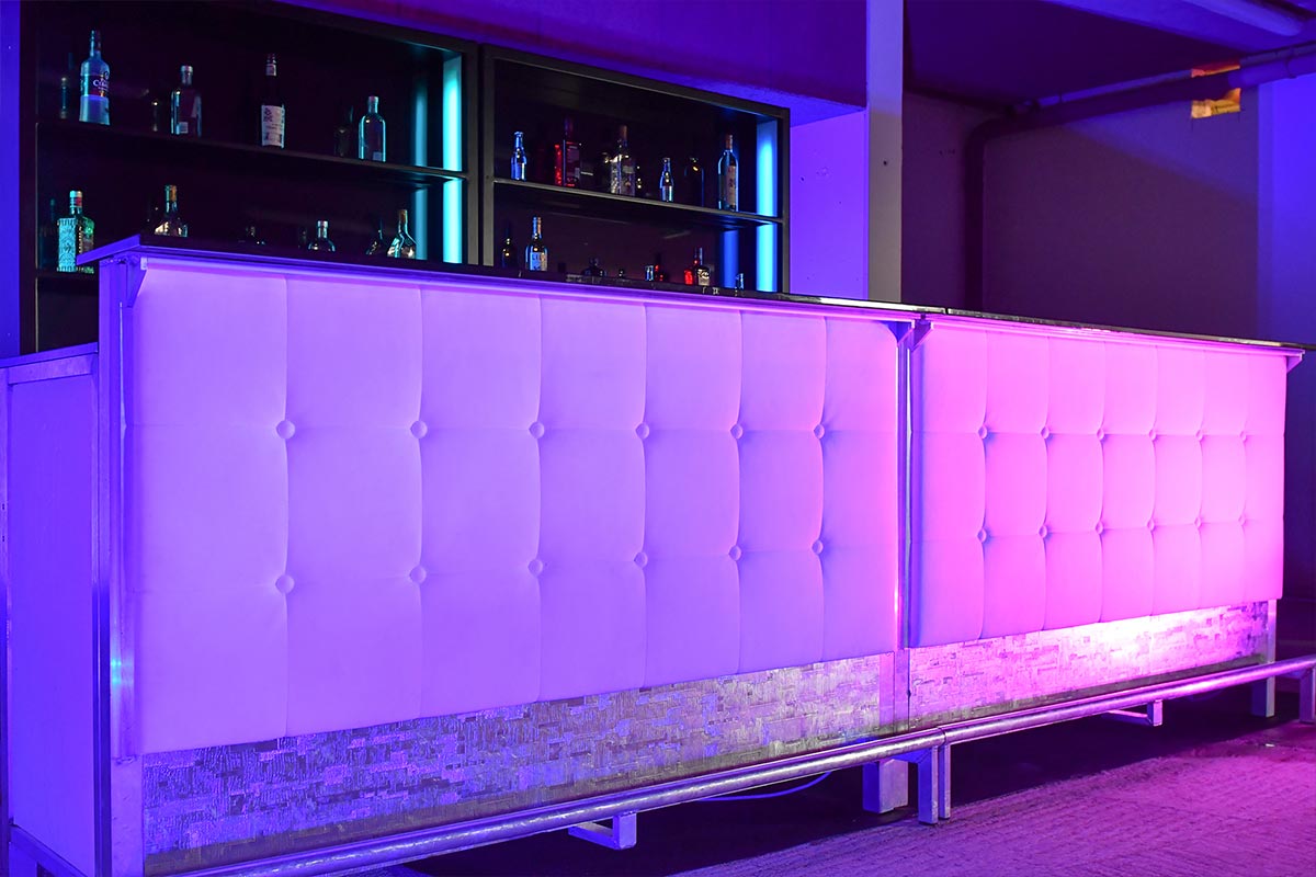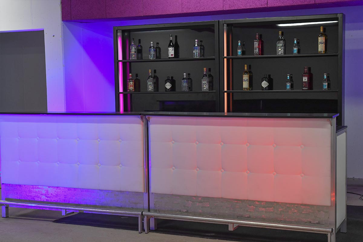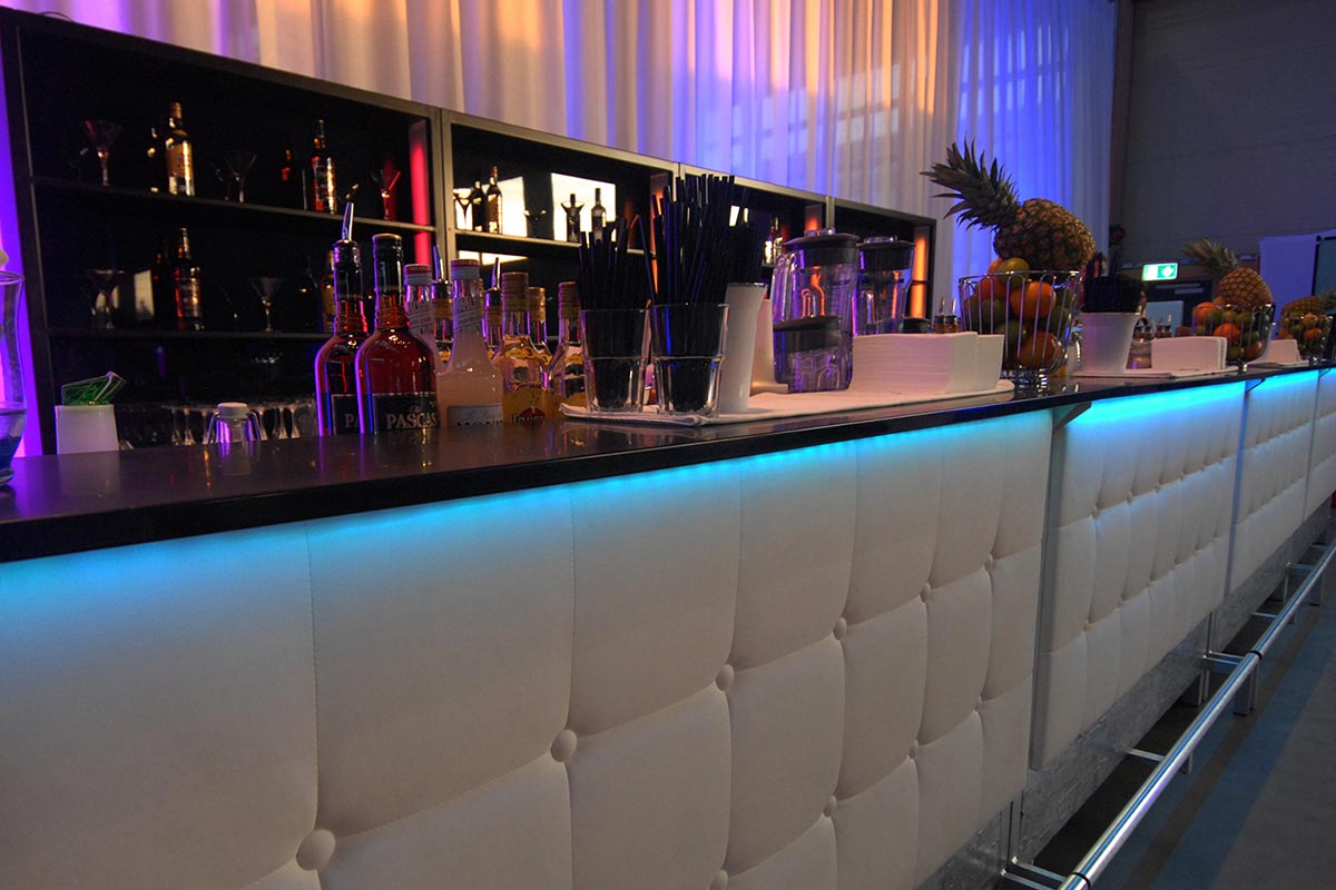 Hier finden Sie die sehr flexible Klappbar für jede Größe Ihrer Veranstaltung, sowie die elegante weiße, mit Kunstleder bespannte Barvariante bis zu ca. 11m Länge.